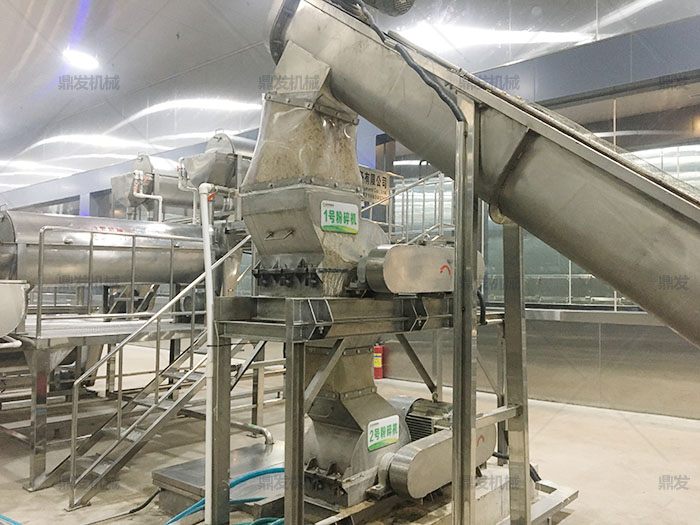 粉碎工序是薯類(lèi)淀粉生產(chǎn)的主要工序之一,薯塊的粉碎屬于濕粉碎,用通用型的粉碎機(jī)就有很多不足之處,主要表現(xiàn)為效率低、能耗大、噪音和振動(dòng)都很劇烈等。據(jù)眾多中外專(zhuān)家研究論證,薯塊的粉漿不宜過(guò)細(xì),其原因?yàn)椋?、粉碎時(shí)間過(guò)長(zhǎng)會(huì)損傷淀粉顆粒;2、不溶于水的果膠與細(xì)渣和被損傷的淀粉顆粒相互粘連,使分離工序增加了難度,影響淀粉質(zhì)量,反而降低了得率。
